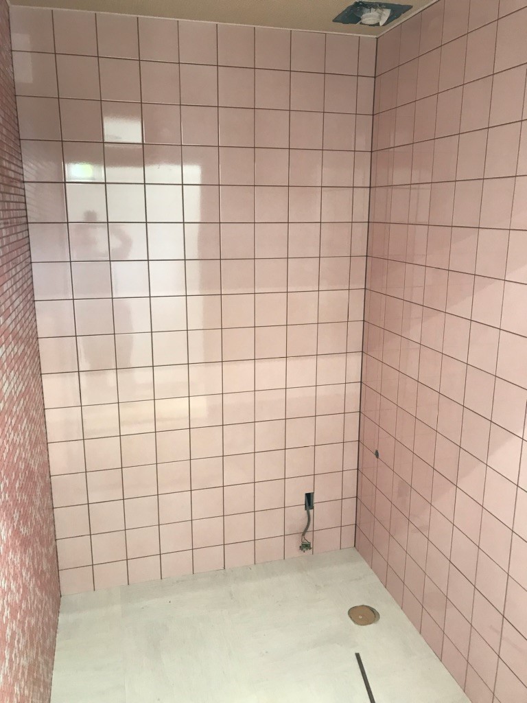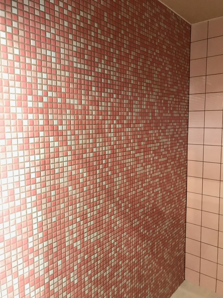 今回店内の内装工事とトイレの工事は同時に行われたのですが、店内の内装工事の方々も「このタイル張り綺麗だな~」「タイルを綺麗に貼るの難しんだよな~」なんて感心しながら女性用トイレの工事をながめていました。