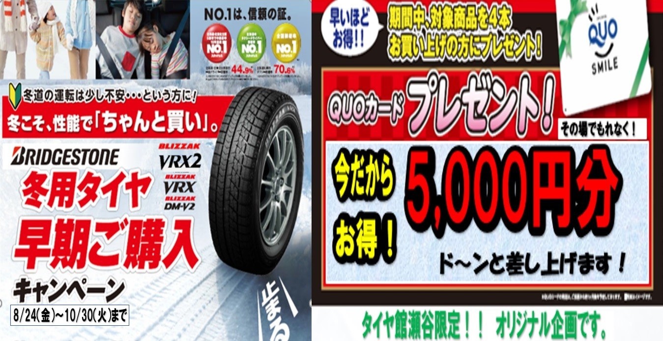 また、10月30日までは対象のスタッドレスタイヤお買い上げで「クオカード5000円プレゼント」の企画も行っております。
