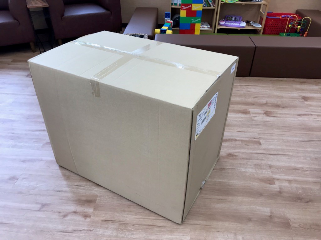 大きなダンボール箱にスタッフ一同「一体なに?」「誰が何を頼んだの?」とざわざわし始めました。