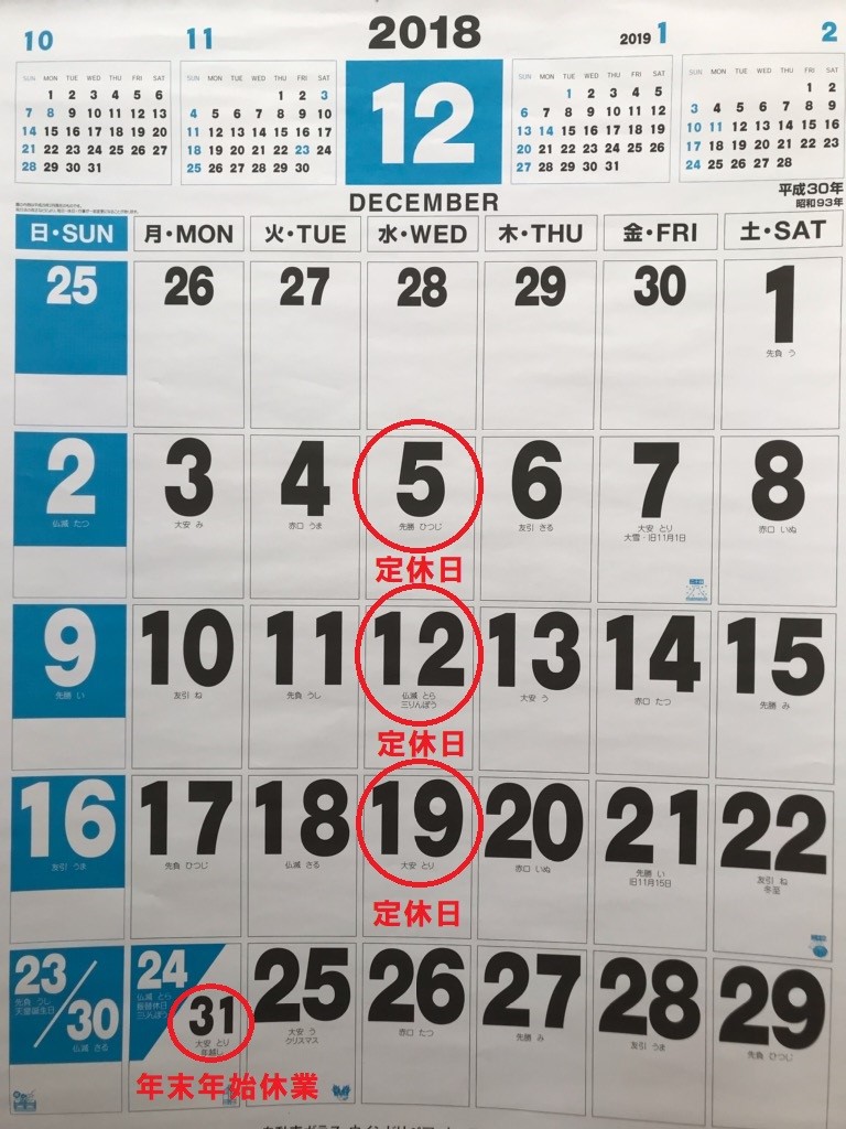 12月の定休日のご案内です ポスト 2018年11月30日 12月お休みは 5日(水) 12日(水) 19日(水) 31日(大晦日)です。 20日(木)~30日(日)までは休まず営業いたします。 営業時間は 平日 10:00~19:00 (受け付けは閉店30分前18:30まで) 日曜・祝日 10:00~18:00 (受け付けは閉店30分前17:30まで) 12月もお客様のご来店をスタッフ一同お待ちしております。 カテゴリ:お知らせ