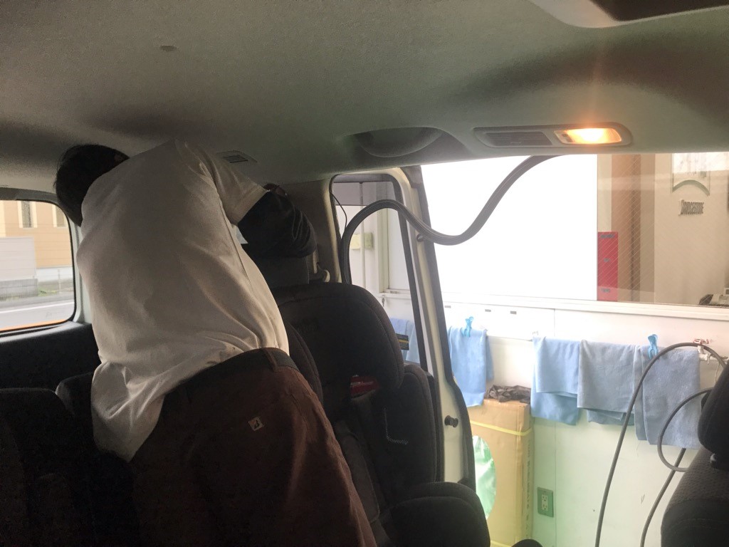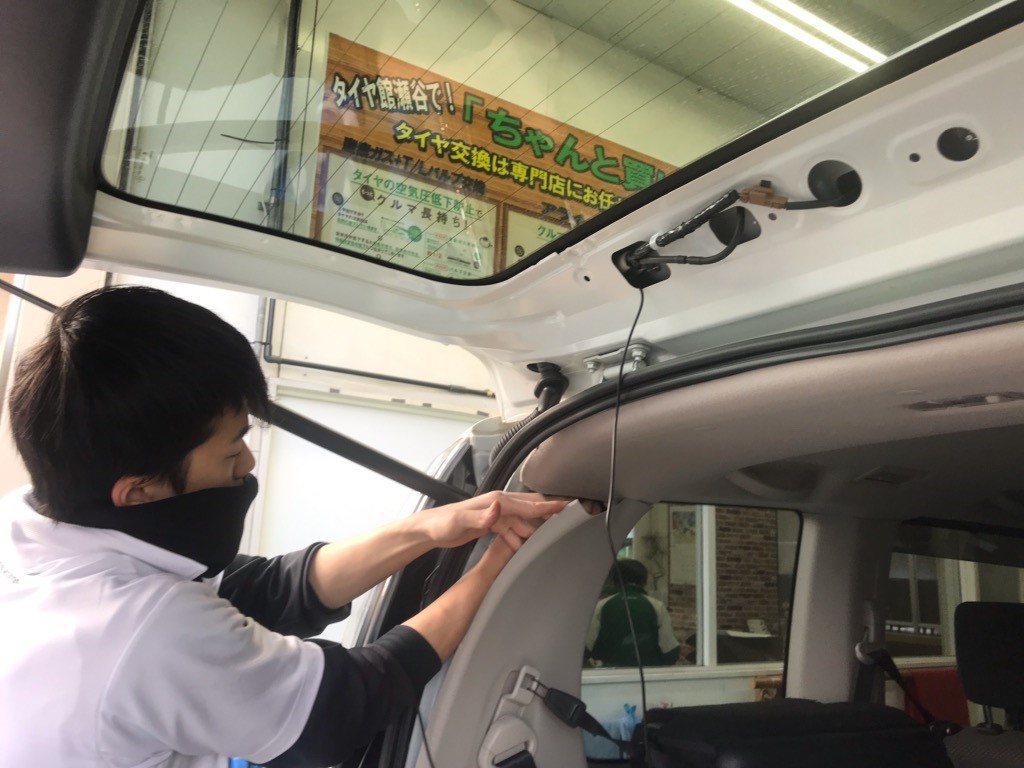 後ろの取付が終わったらなが~い配線を室内の天井裏へ隠しながら運転席周辺まで通していきます。