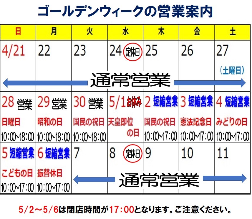 ただし、5月2日~5月6日までの5日間は営業時間を1時間短縮し10:00~17:00の営業とさせていただきます。