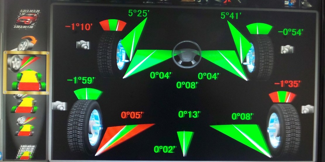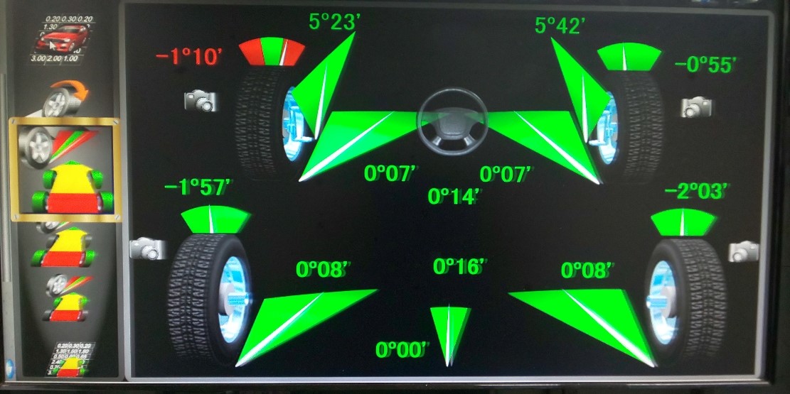 フロントのトーは大きなズレは無いのですがリアのトーとキャンバーがズレているので調整で合わせれば問題ないですね。