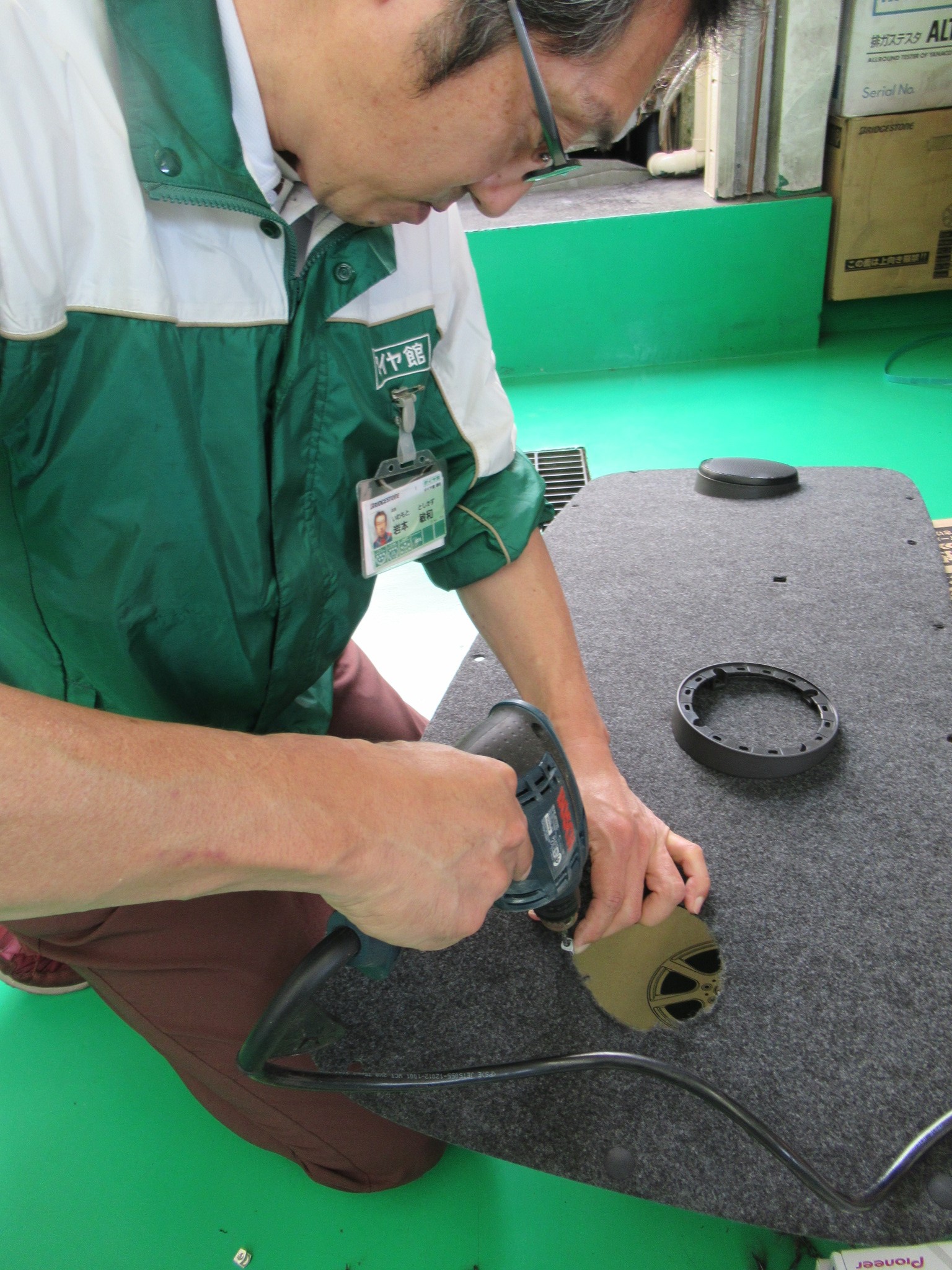 スピーカーを取り付ける穴を電動ドリル・エアーソー(カッター)等で作っています。