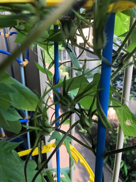 息子が小学校から持ってきたアサガオなのですが、夏休みに入ったとたん水やりをしなくなってしまったので、自分が毎朝水をあげています。