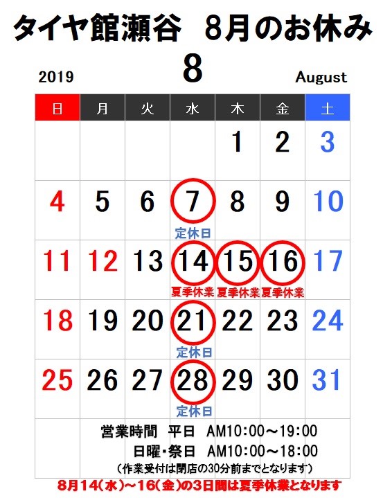 8月の定休日のご案内です ポスト 2019年7月31日 8月のお休みは 7日(水) 14日(水) 15日(木) 16日(金) 21日(水) 28日(水)です。 8月14日(水)~16日(金)は夏季休業となりますのでご注意ください。 営業時間は 平日 10:00~19:00 (受け付けは閉店30分前18:30まで) 日・祝 10:00~18:00(受け付けは閉店30分前17:30まで) 8月もお客様のご来店をスタッフ一同お待ちしております。 カテゴリ:お知らせ