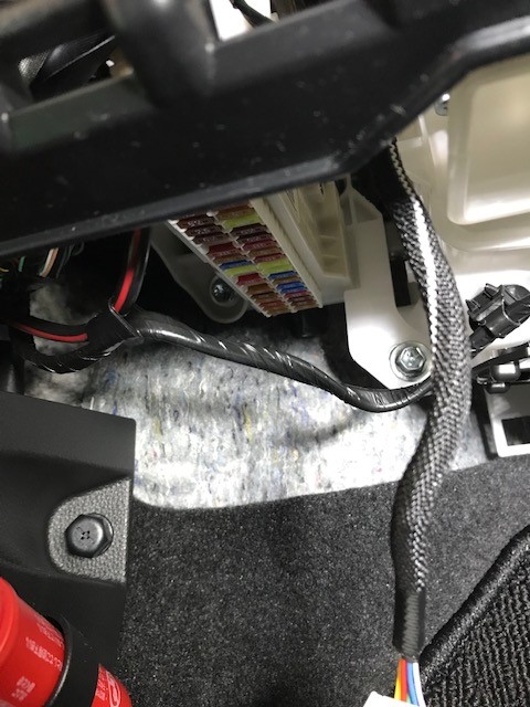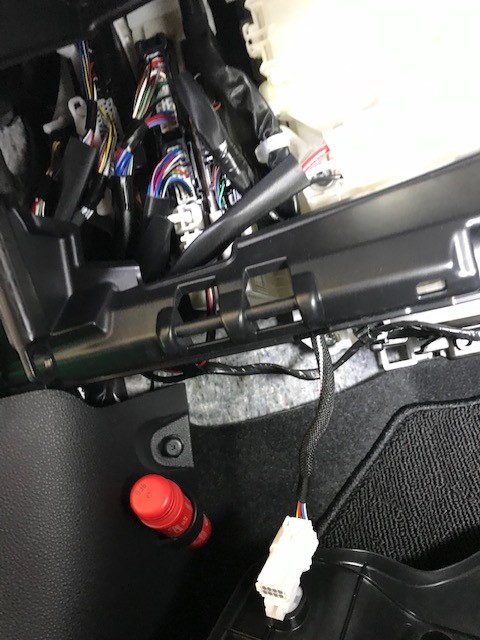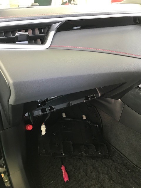 しっかり配線をしたいので、助手席側のグローブボックスと足元のパネルを