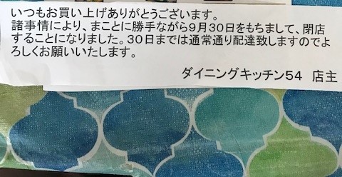 長年お世話になっていた、弁当屋さんが閉店です。お弁当の袋の中に案内の紙が1枚。