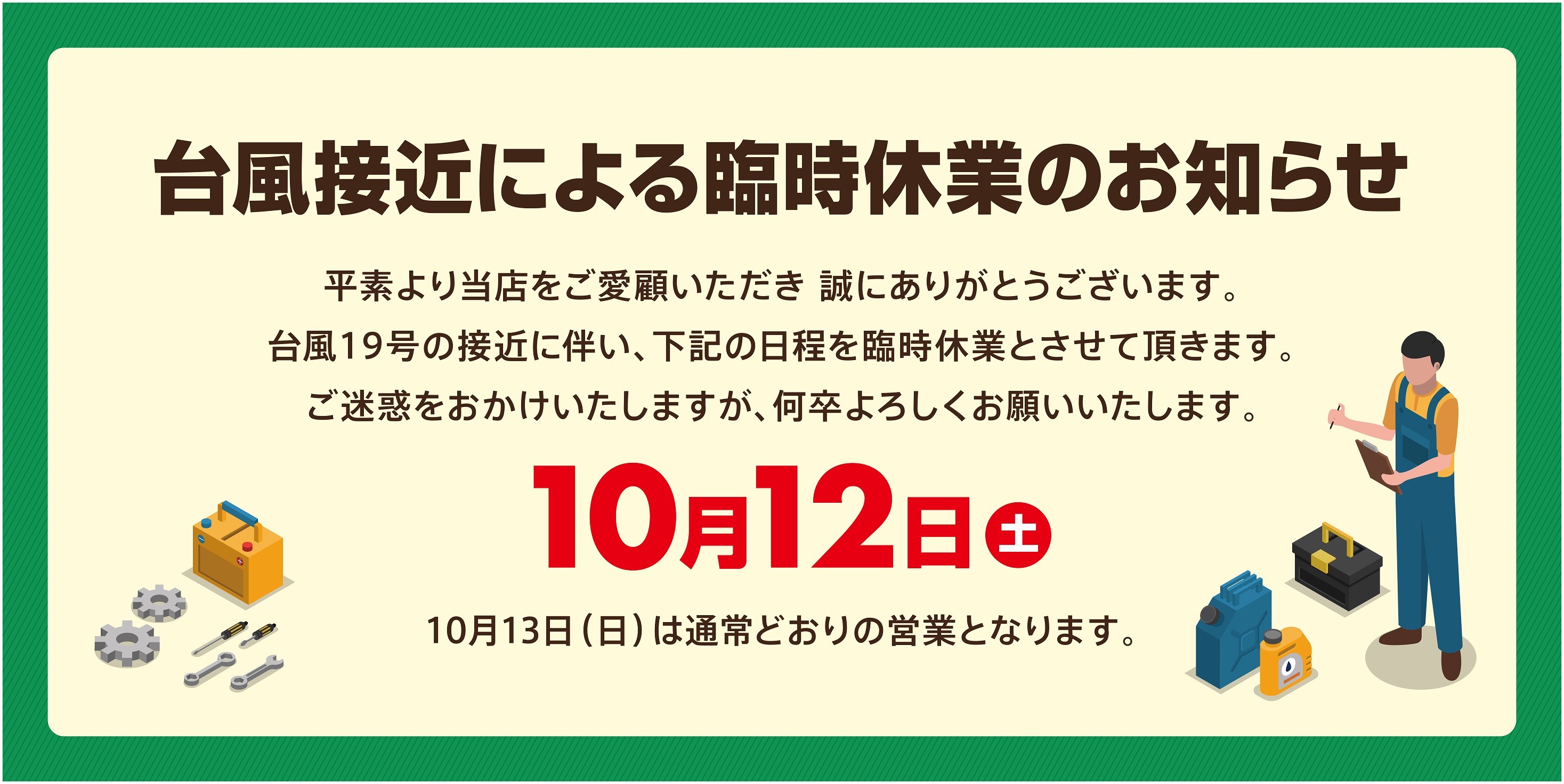 臨時休業のおしらせ ポスト 2019年10月10日 平素は当店をご利用いただき誠にありがとうございます。 さて、すでに報道等でもご存知の通り非常に強い台風19号が関東に近づいております。 先日の千葉での被害などを考えると最大限の警戒が必要だと思います。 そこで、10月12日(土)は台風への備えと安全を最優先し「臨時休業」とさせていただきます。 お客様にはご不便をおかけいたしますが、何卒ご理解くださいませ。 13日(日)は今のところ通常営業の予定ですが、台風の進路や被害が出た場合は営業時間を変更することもございますのでご了承ください。 カテゴリ:お知らせ