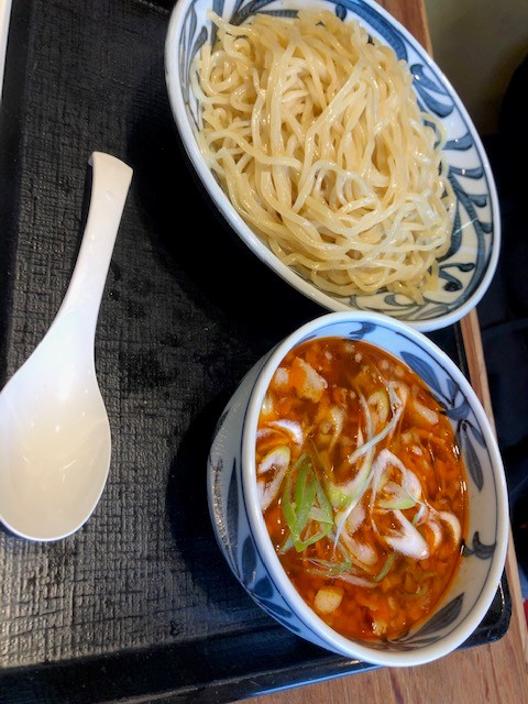 うちの奥さんはピリ辛肉つけ麺ヲ注文していました。
