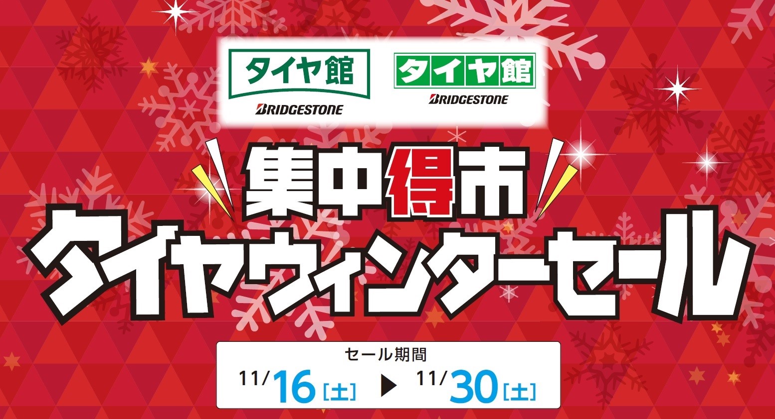 今年最後のビックセール!「タイヤウィンターセール(集中得市)」開催です ポスト 2019年11月15日 11月16日(土)~11月30日(土)まで今年最後のビックセール 「タイヤウィンターセール(集中得市)」を開催いたします。 冬の必需品であるスタッドレスタイヤはもちろん、ノーマルタイヤもお買い得品を多数ご用意しております。 年末年始のお出かけ前のエンジンオイル・バッテリー・ワイパーなどのお車のメンテナンスもこの機会にぜひどうぞ! 期間中はお得が盛りだくさんです。 ぜひご来店くださいませ。 カテゴリ:お知らせ