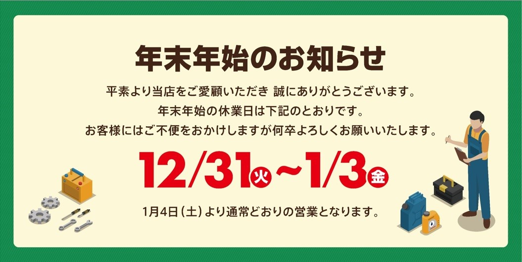 年末年始の営業のご案内 ポスト 2019年12月17日 年末年始の営業のご案内です。 年内は12月30日(月)まで営業いたします。 12月31日(大晦日) 1月1日(元日) 2日(木) 3日(金)はお休みさせていただきます。 新年は1月4日(土)「初売りセール」より開始となります。 お間違えの無いようよろしくお願いいたします。 カテゴリ:お知らせ