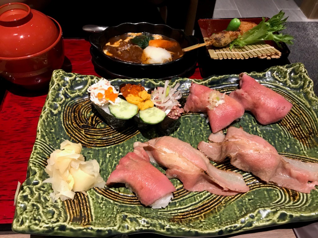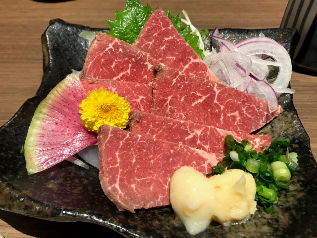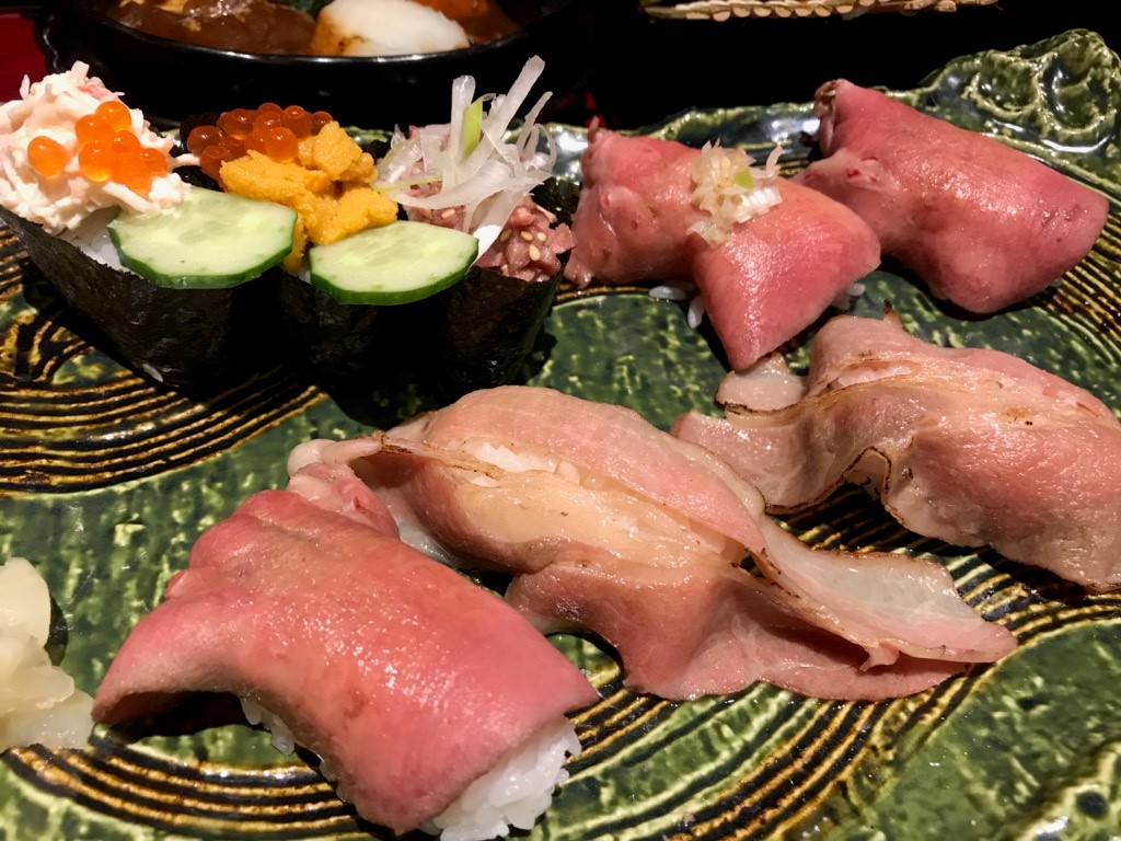 牛刺しや肉寿司、牛タン焼きをお腹いっぱい食べました。