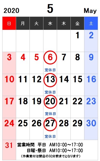 5月の定休日のご案内です ポスト 2020年5月1日 5月のお休みは 6日(水) 13日(水) 20日(水) 27日(水) です。 営業時間は 平日 10:00~17:00 (受け付けは閉店30分前16:30まで) 日・祝 10:00~17:00(受け付けは閉店30分前16:30まで) 5月もお客様のご来店をスタッフ一同お待ちしております。 *新型コロナウィルスの感染拡大防止に伴う「緊急事態宣言」の発令により営業時間が短縮となっております。ご不便をおかけいたしますがお客様のご理解とご協力をお願い申し上げます。 カテゴリ:お知らせ