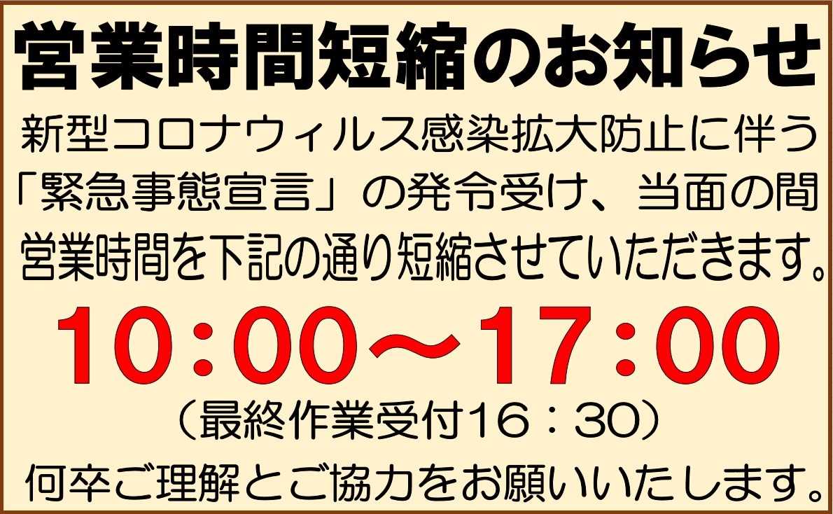 新型コロナウィルスの感染拡大による「緊急事態宣言」が発令された4月上旬から営業時間を短縮した「時短営業」を続けております。
