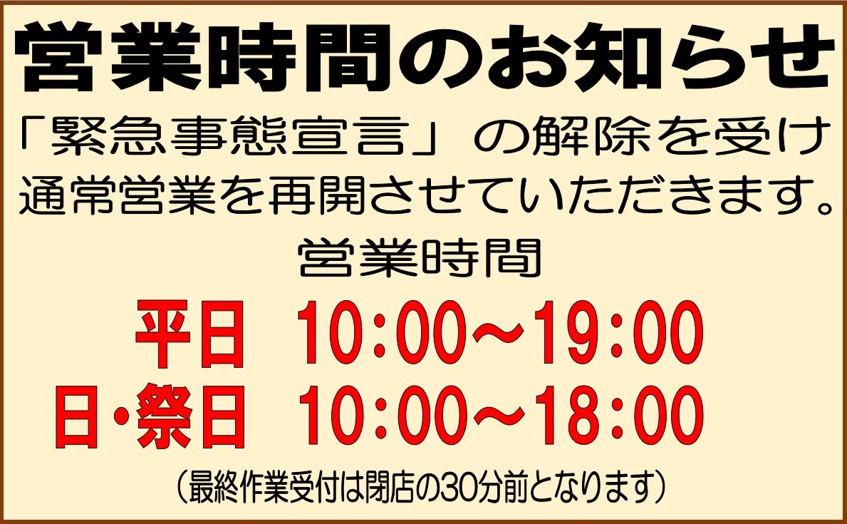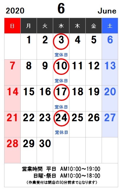 6月の定休日のご案内です ポスト 2020年5月31日 6月のお休みは 3日(水) 10日(水) 17日(水) 24日(水) です。 営業時間は 平日 10:00~19:00 (受け付けは閉店30分前18:30まで) 日・祝 10:00~18:00(受け付けは閉店30分前17:30まで) 6月もお客様のご来店をスタッフ一同お待ちしております。 カテゴリ:お知らせ