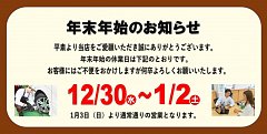 新年あけましておめでとうございます。 いよいよ2021年がスタートしました。 当店では12月30日(水)~1月2日(土)までお休みをいただいております。 お客様にはご迷惑をおかけいたしますが何卒ご理解のほどよろしくお願いいたします。 2021年もスタッフ一同「お客様の安心・安全な...
