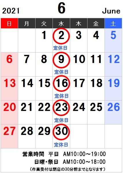 6月のお休みは 2日(水) 9日(水) 16日(水) 23日(水) 30日(水) です。 営業時間は 平日 10:00~19:00 (受け付けは閉店30分前18:30まで) 日・祝 10:00~18:00(受け付けは閉店30分前17:30まで) 6月もお客様のご来店をスタッフ一同お待ちしております。