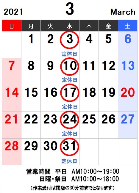 3月のお休みは 3日(水) 10日(水) 17日(水) 24日(水) 31日(水)です。 営業時間は 平日 10:00~19:00 (受け付けは閉店30分前18:30まで) 日・祝 10:00~18:00(受け付けは閉店30分前17:30まで) 3月もお客様のご来店をスタッフ一同お待ちしております。