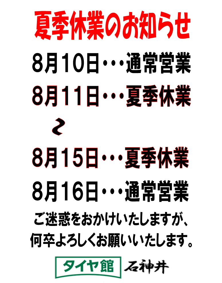 8月の定休日のご案内 ポスト 2021年7月27日 2021年8月の定休日は 4日(水) 11日(水) 12日(木) 13日(金) 14日(土) 15日(日) 18日(水) 25日(水) となります。 なお、11日(水)~15日(日)までは夏季休業となります。 ご迷惑をおかけいたしますが、何卒よろしくお願いいたします。 カテゴリ:お知らせ