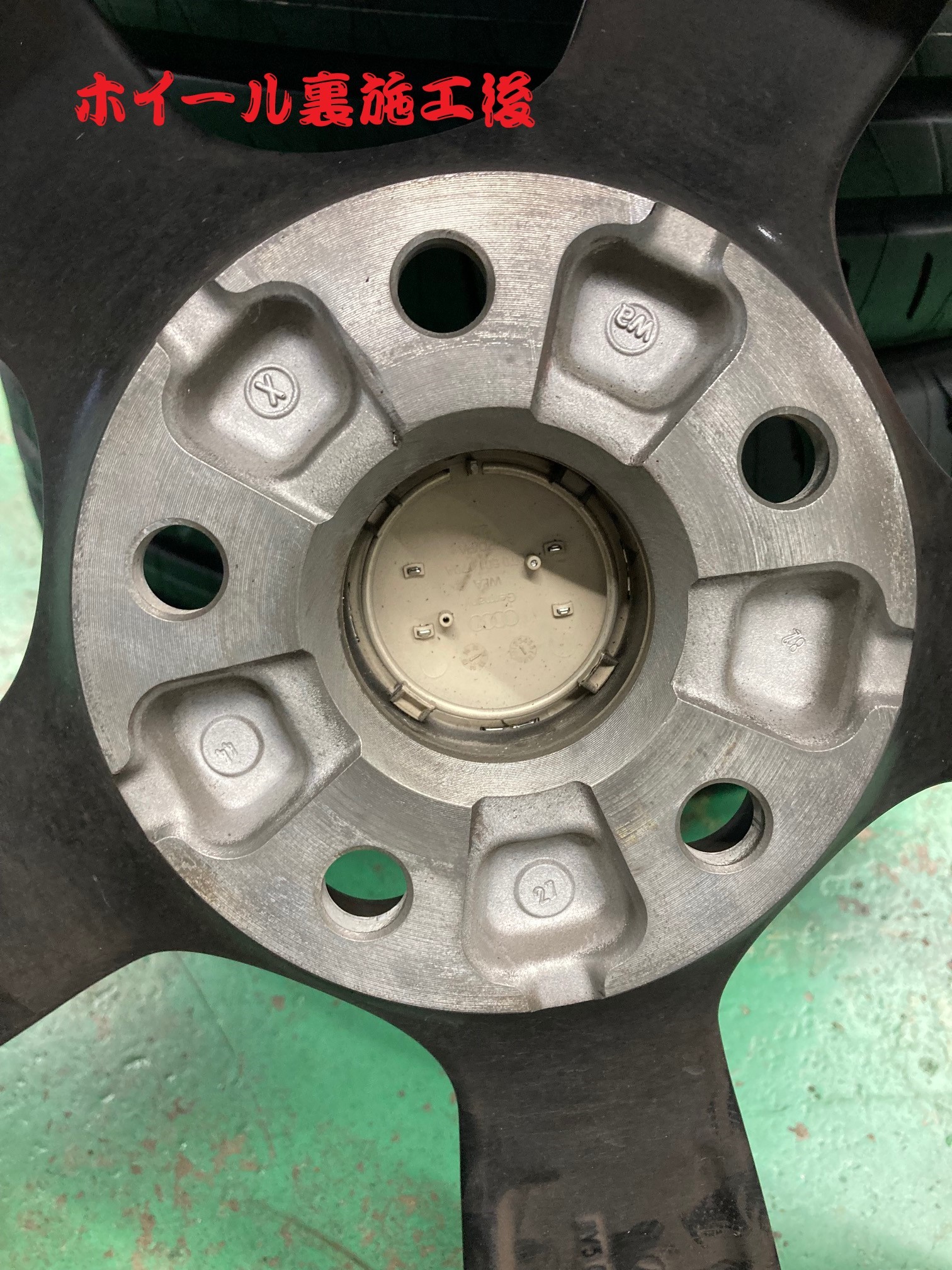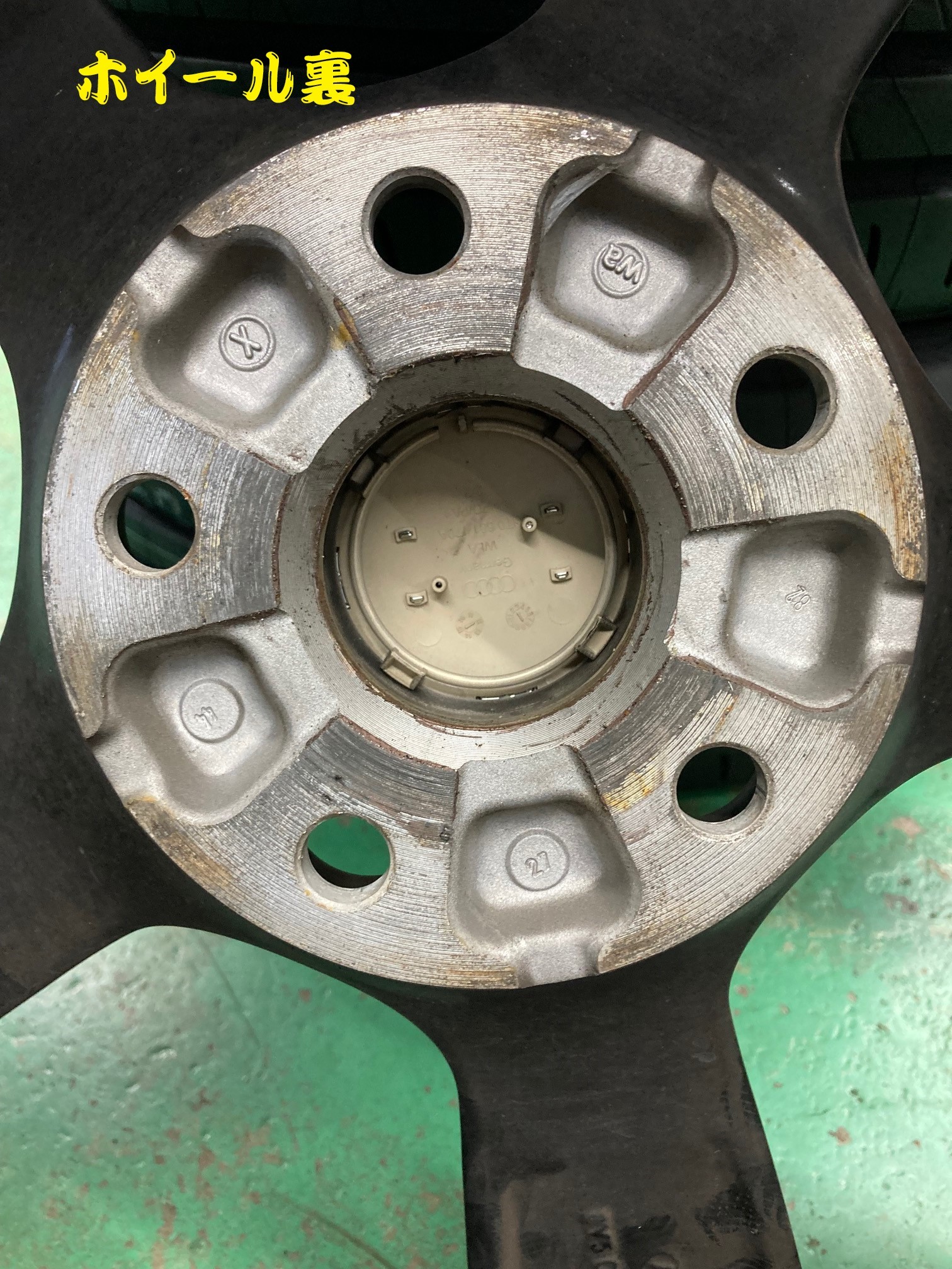 ホイールの裏面、ハブと接触する部分にも赤サビが付着しています。