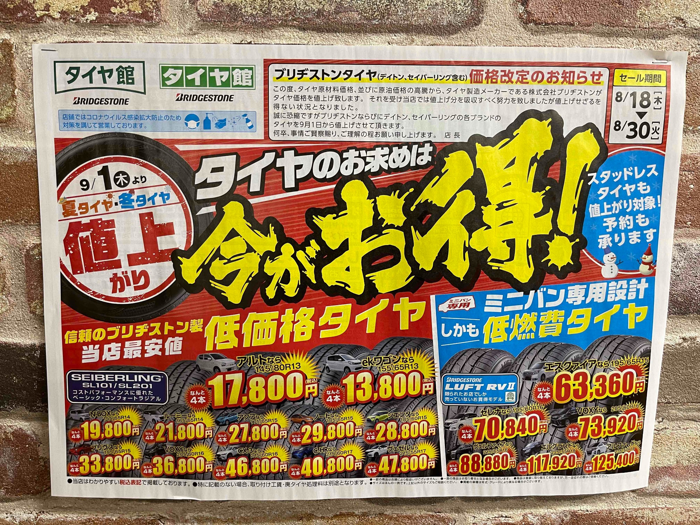 ※9月1日ブリヂストンタイヤの値上げが決定!!