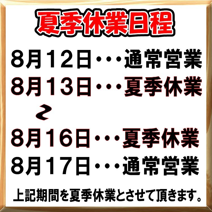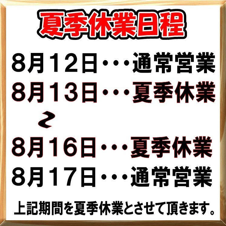 夏季休業のお知らせ!! ポスト 2024年8月9日 おはようございます。 タイヤ館石神井です 先日こちらでもお伝えしたと思いますが、再度お伝え致します。 当店タイヤ館石神井では13日~16日まで夏季休業となります。 ご利用のお客様には大変ご迷惑おかけしますが、ご理解の程よろしくお願い致します。 なお、12日までは通常通り朝10時~19時(作業受け18時30分終了)で営業しておりますので どうぞご利用下さい。
