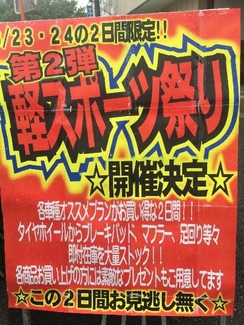 もうすぐ開催! ポスト 2018年6月12日 みなさん、こんにちは^^ 今日は、お知らせです! 来週の23(土)・24(日)は、もうご存知かと思いますが、 『軽スポーツ祭 第2弾』を開催します! 色々な商品の展示やお買い得な商品を取り揃えて みなさまのご来店をお待ちしています^^ これから、少しずつ『祭』の内容をUPしていきますので、 お見逃しなく^^ 担当:藪崎