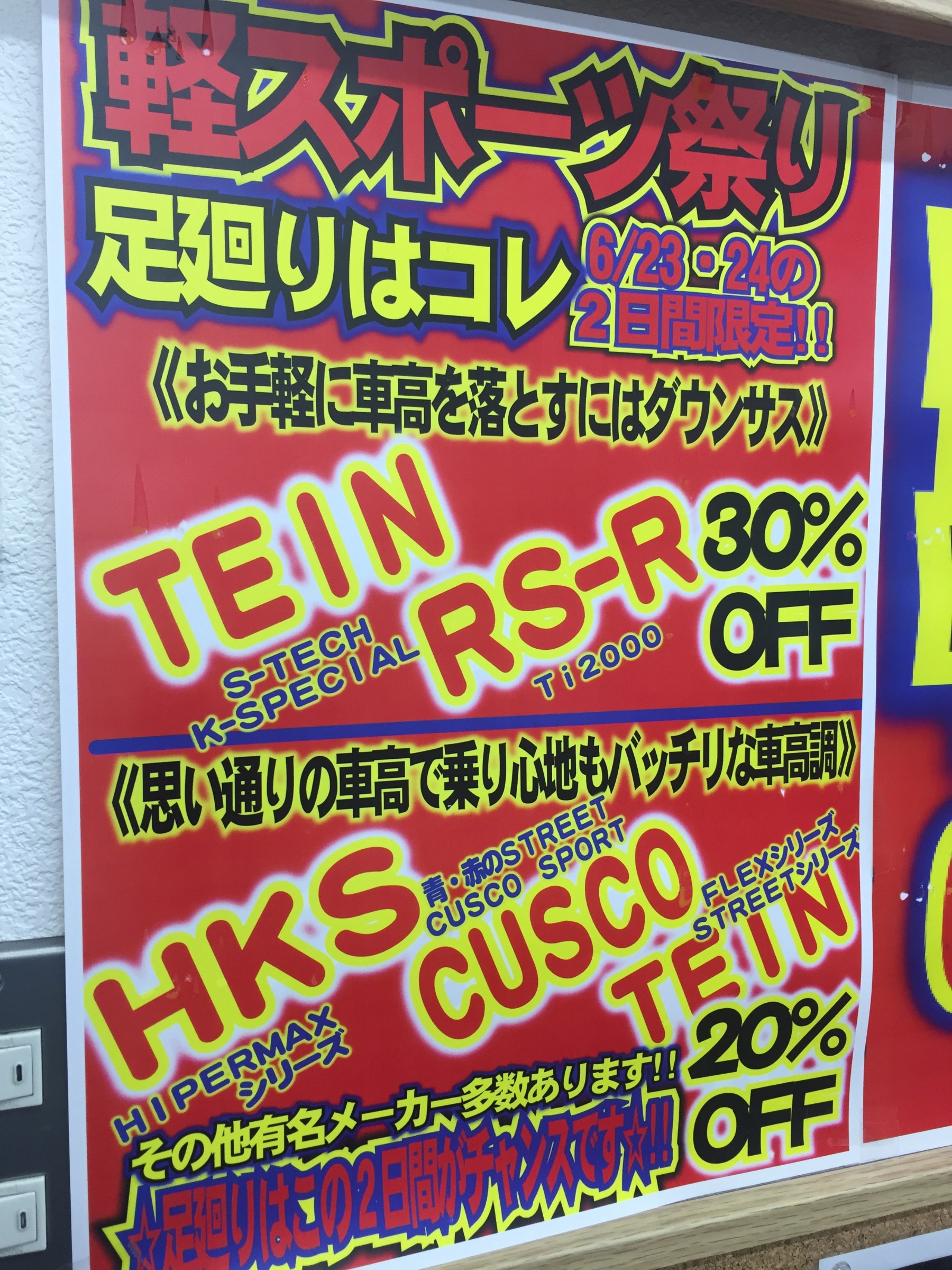 『軽スポーツ祭 第2弾』情報 その2 ポスト 2018年6月17日 みなさん、こんにちは^^ 次の週末 23日(土)・24日(日)の 『軽スポーツ祭』の情報を チョットだけお知らせします。 今回は、GTパーツと呼ばれるものも お買得にということで、 スポーツ走行もドレスアップも 基本の足廻りのキャンペーンも組み込みます^^ 走行中のふらつきが気になる方、 カッコ良く車を仕上げたい方 是非、このチャンスにGETしましょう^^ 担当:藪崎