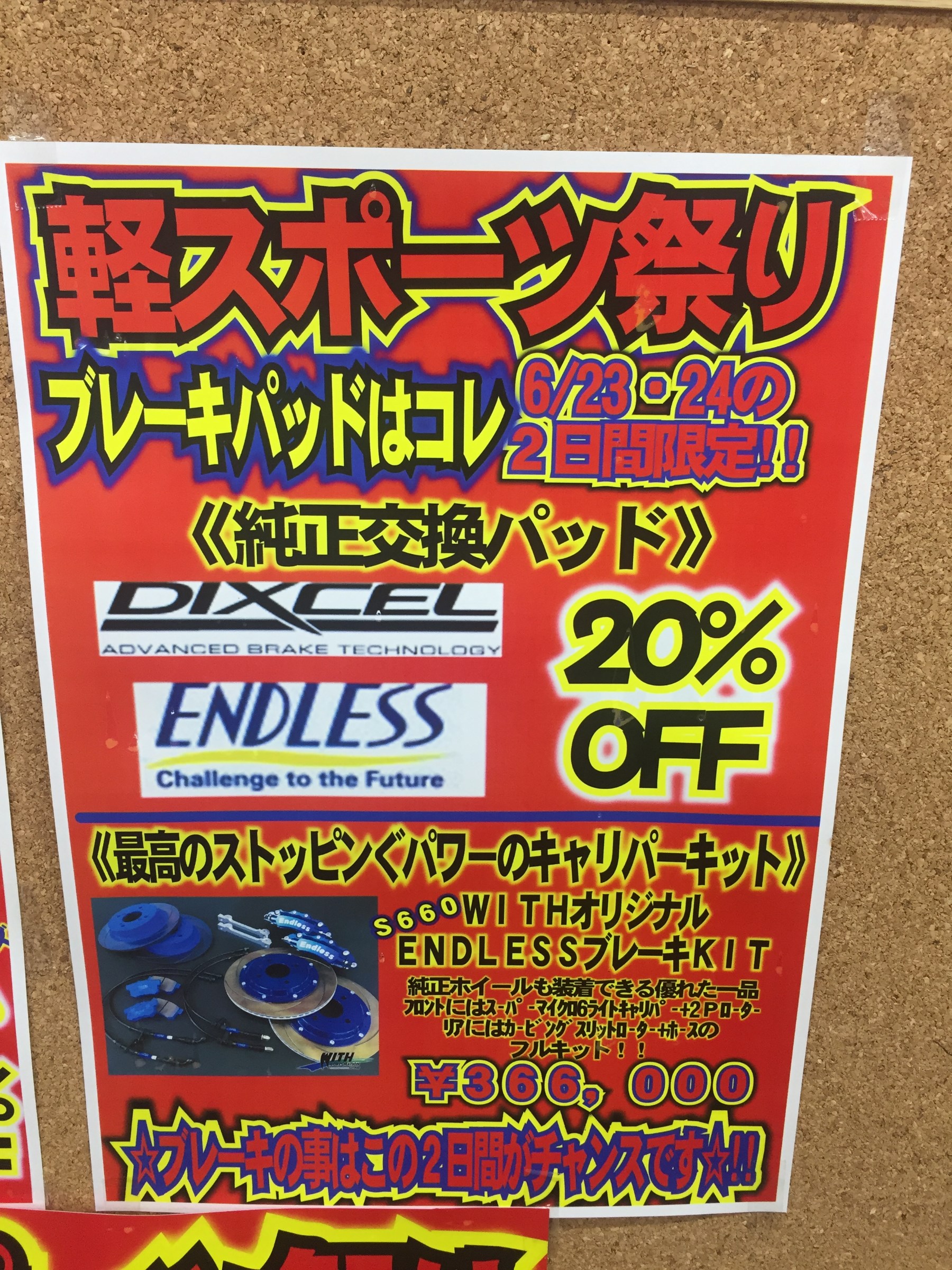 『軽スポーツ祭 第2弾』 情報 その3 ポスト 2018年6月19日 みなさんこんにちは^^ 昨日の大阪北部地震で被害に遭われた方には、 心よりお見舞い申し上げます。 1日も早く、復旧・復興をされることを お祈りいたします。 さて、今日は開催まで5日に迫った 『軽スポーツ祭 第2弾』 6/23(土)・24(日) の情報をお伝えします^^ ブレーキパーツもお買い得な2日間です。 そろそろ交換かな?と思っている方、 この2日間が狙い目ですよ^^ 担当:藪崎