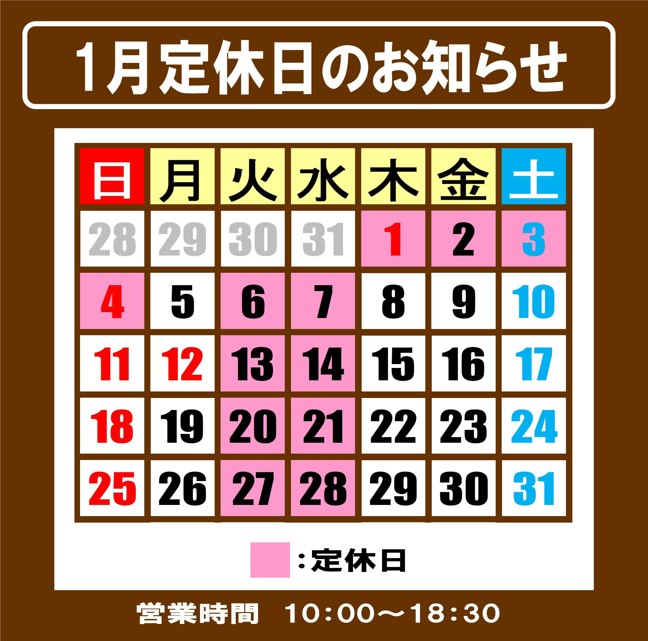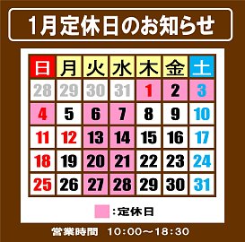 1月定休日のお知らせ