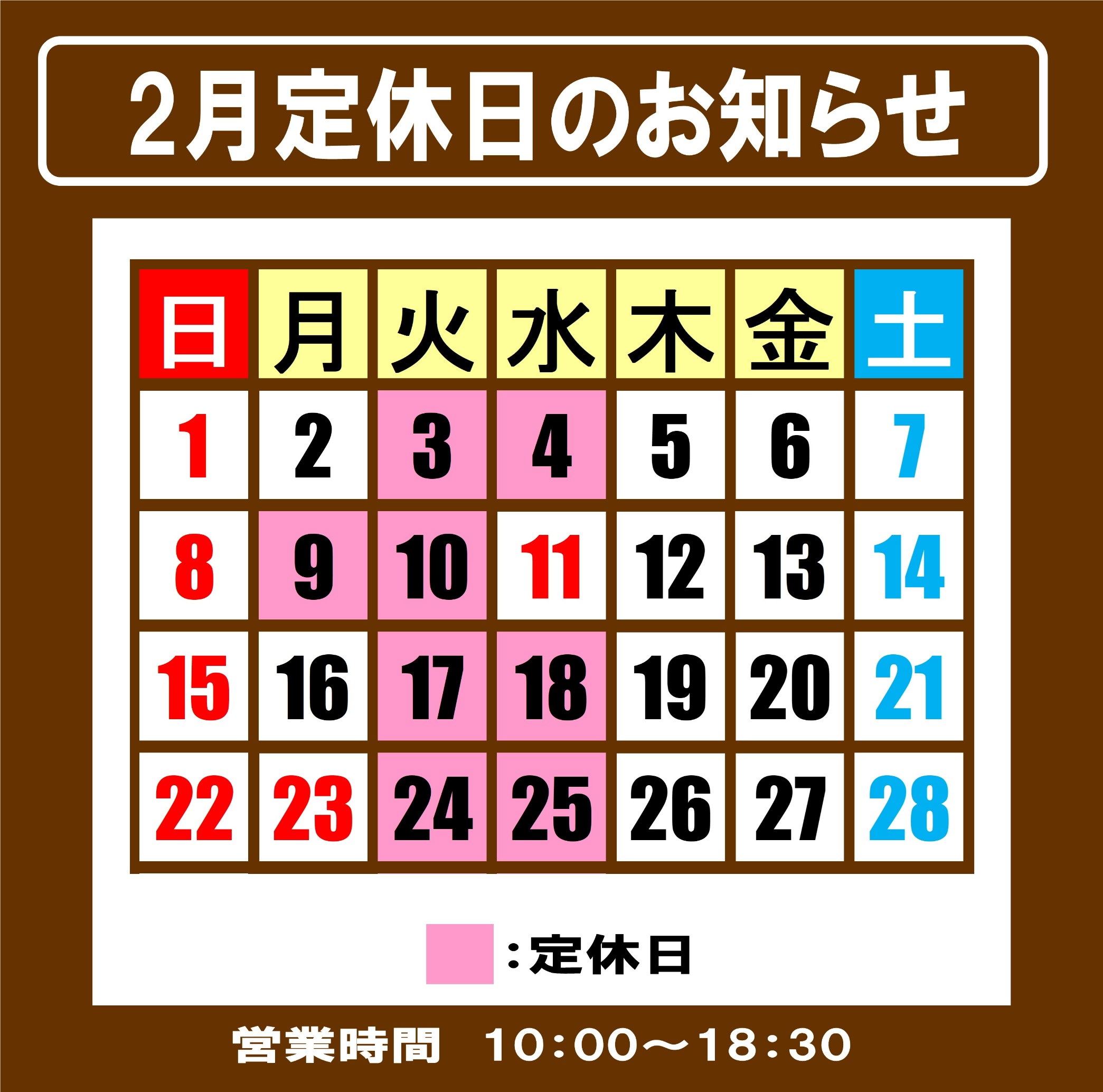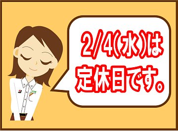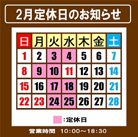 本日、2/10は定休日となります。明日、2/11は水曜日ですが通常営業となります。