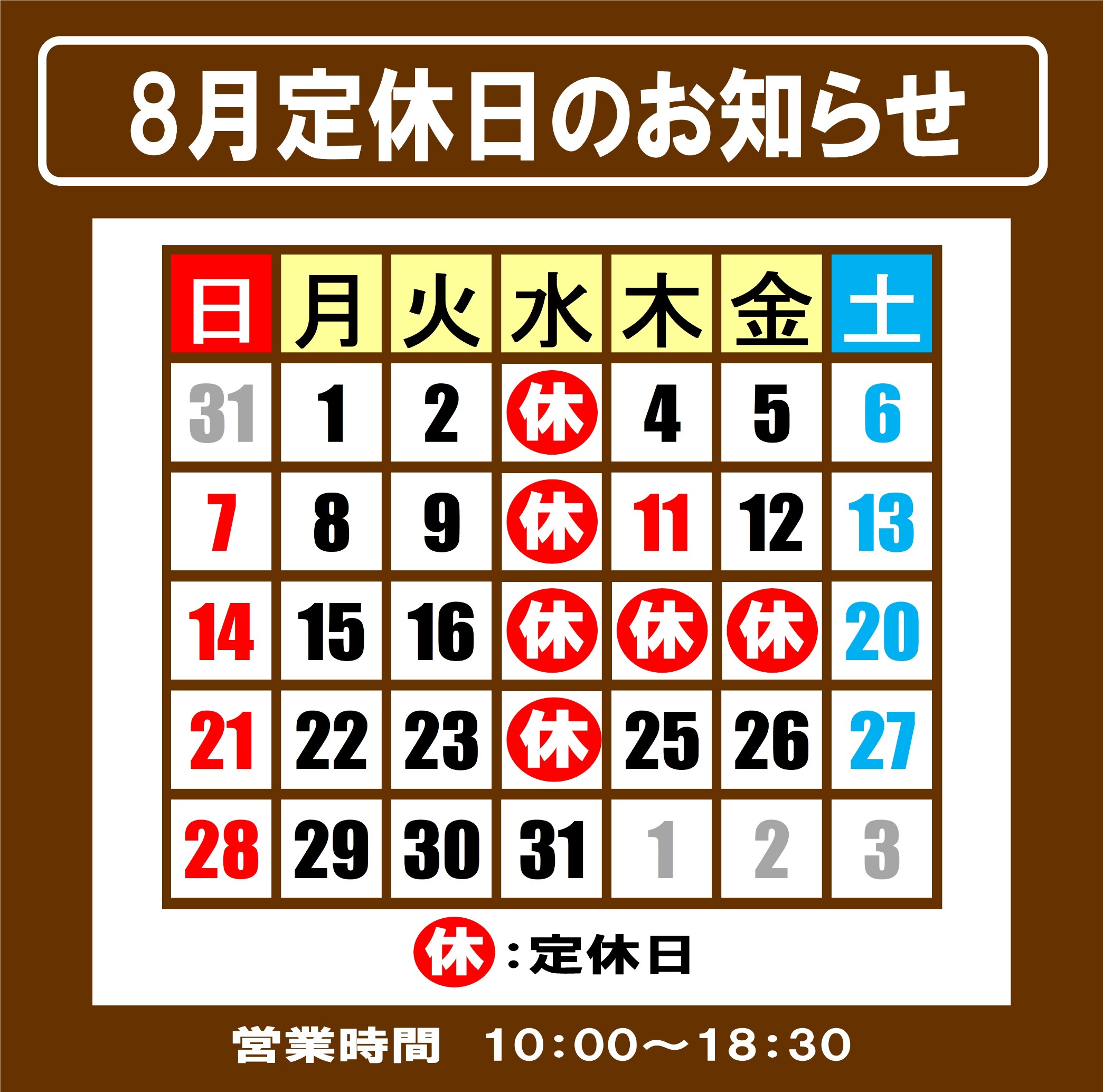 8月定休日のお知らせ ポスト 2022年8月1日 タイヤ館しばた 8月の定休日は 下記のとおりとなります。 18日(木)・19日(金)は 臨時休業となります。 31日(水)は 通常営業です。 ご来店お待ちしております。 タイヤ館 しばた 住所:957-0062新潟県新発田市富塚町3-3-6 電話番号: 0254-27-5131 相談予約 タイヤ点検・安全点検/タイヤ履き替え/オイル交換/その他ピット作業の予約