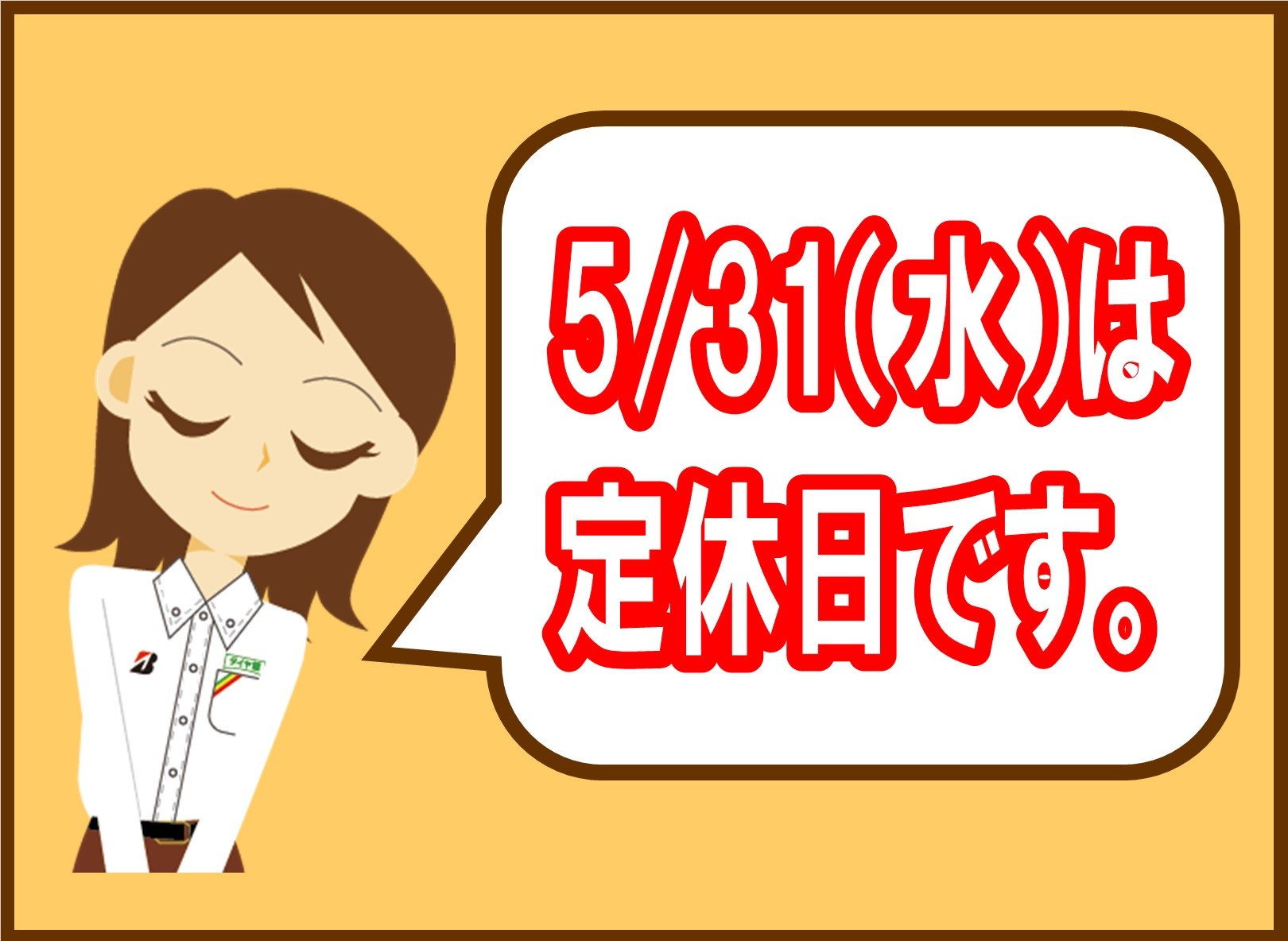 5月31日は定休日です。 ポスト 2023年5月31日 タイヤ館しばたの ホームページをご覧いただき ありがとうございます。 5月31日は定休日です。 6月の定休日は 毎週水曜日となります。 ご迷惑をおかけしますが よろしくお願いいたします。 タイヤ館 しばた 住所:957-0062新潟県新発田市富塚町3-3-6 電話番号: 0254-27-5131 相談予約 タイヤ点検・安全点検/タイヤ履き替え/オイル交換/その他ピット作業の予約