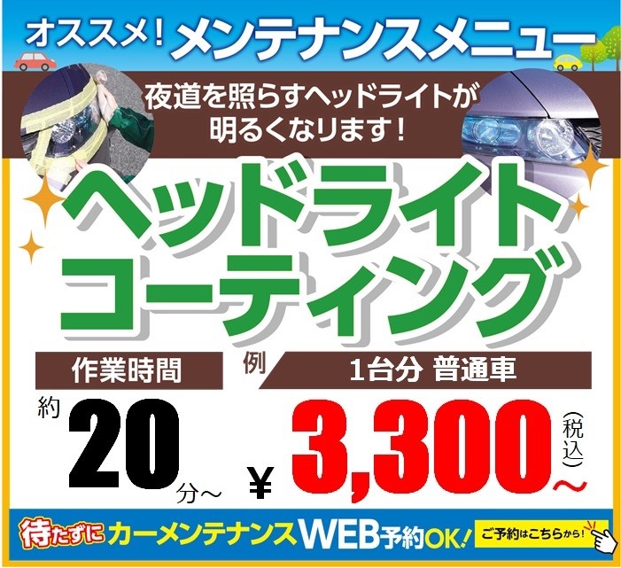 キレイな目元を取り戻しませんか?? ポスト 2023年6月5日 近年のクルマの ヘッドライトレンズは ほとんどが樹脂製で、 紫外線や点灯時の熱による経年劣化で 黄ばみやくすみが発生します。 放っておくとひび割れが発生することがあり、 そのままでは光量不足を招いて 車検に通らないこともあります。 ヘッドライトコーティングは、 表面のコートを剥離し、 丁寧に研磨したあとに コーティングを施し、 より美しく仕上げ 耐久性を高めます。 タイヤ館 しばた 住所:957-0062新潟県新発田市富塚町3-3-6 電話番号: 0254-27-5131 相談予約 タイヤ点検・安全点検/タイヤ履き替え/オイル交換/その他ピット作業の予約