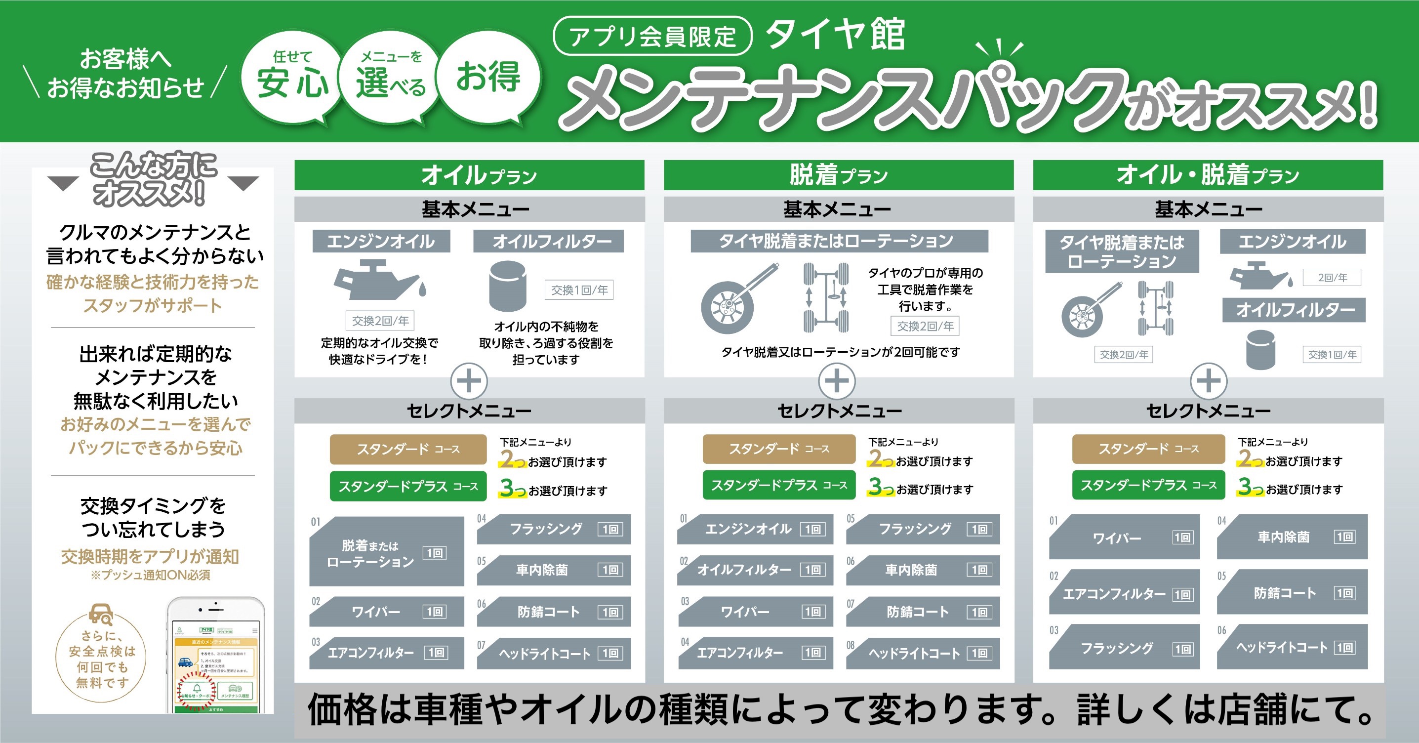 お車のメンテナンスは、タイヤ館の「メンテナンスパック」がお得!!