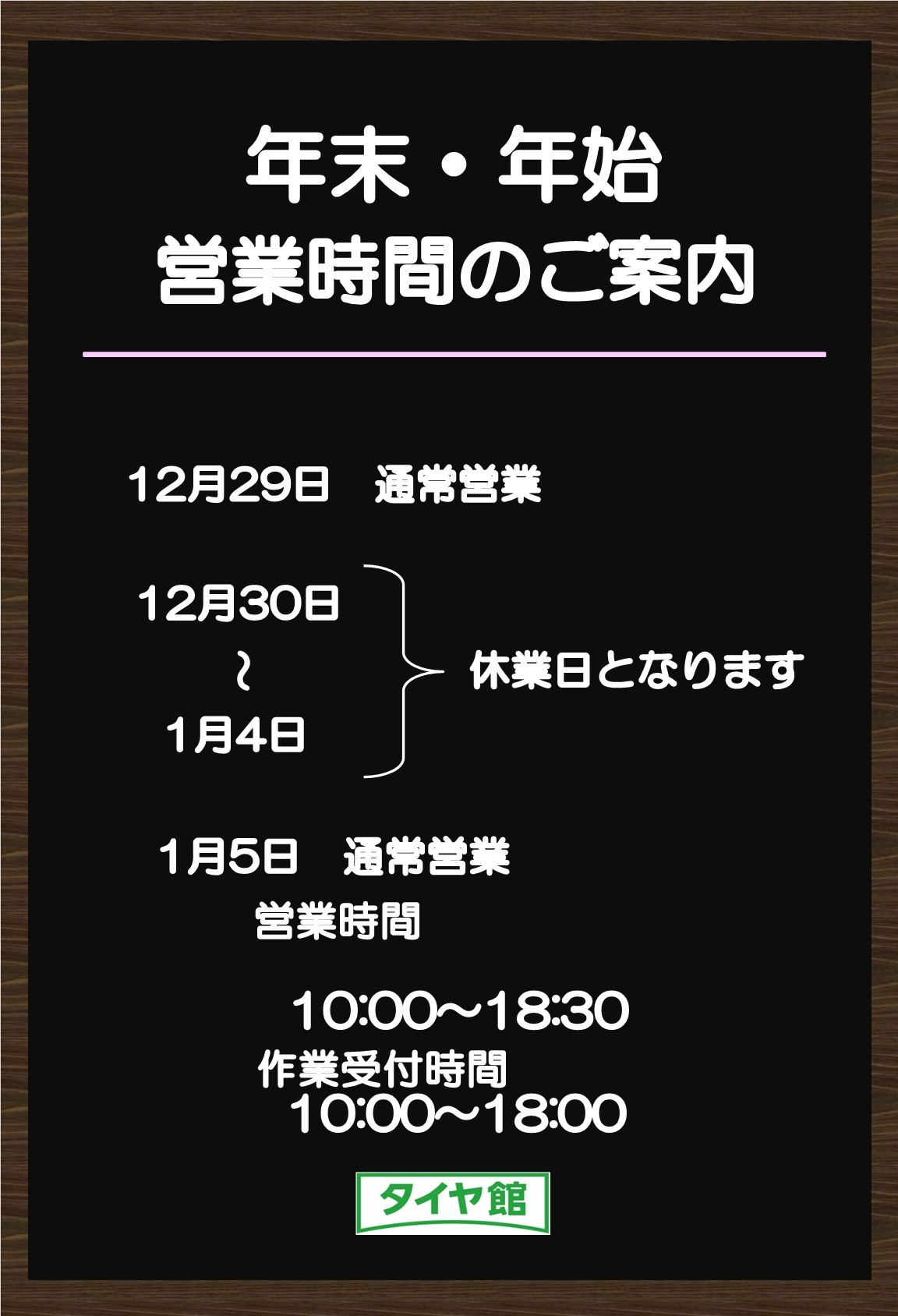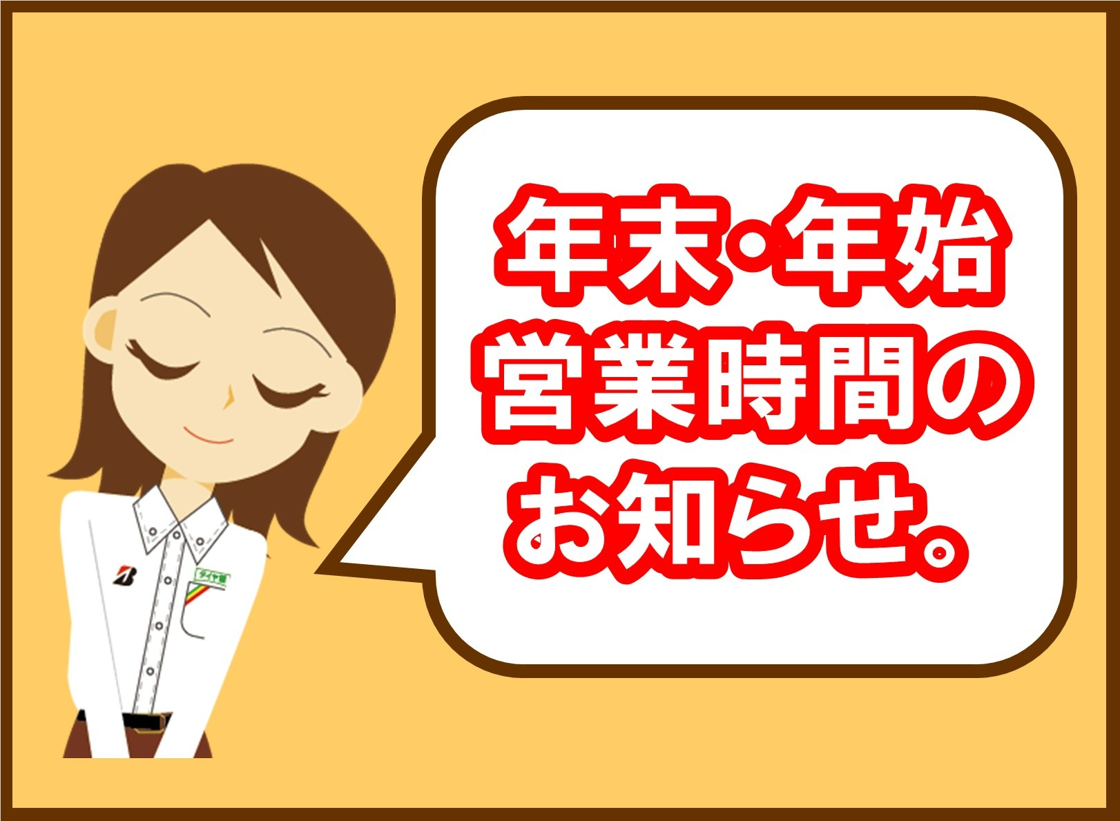 年末・年始営業時間のお知らせ ポスト 2023年12月19日 タイヤ館しばた 年末・年始の 営業時間は 以下の通りとなります。 年内は12/29(金) までの営業となります。 2024年は 1月5日(金) 10:00より 営業いたします。 ご来店お待ちしております。 タイヤ館 しばた 住所:957-0062新潟県新発田市富塚町3-3-6 電話番号: 0254-27-5131 相談予約 タイヤ点検・安全点検/タイヤ履き替え/オイル交換/その他ピット作業の予約
