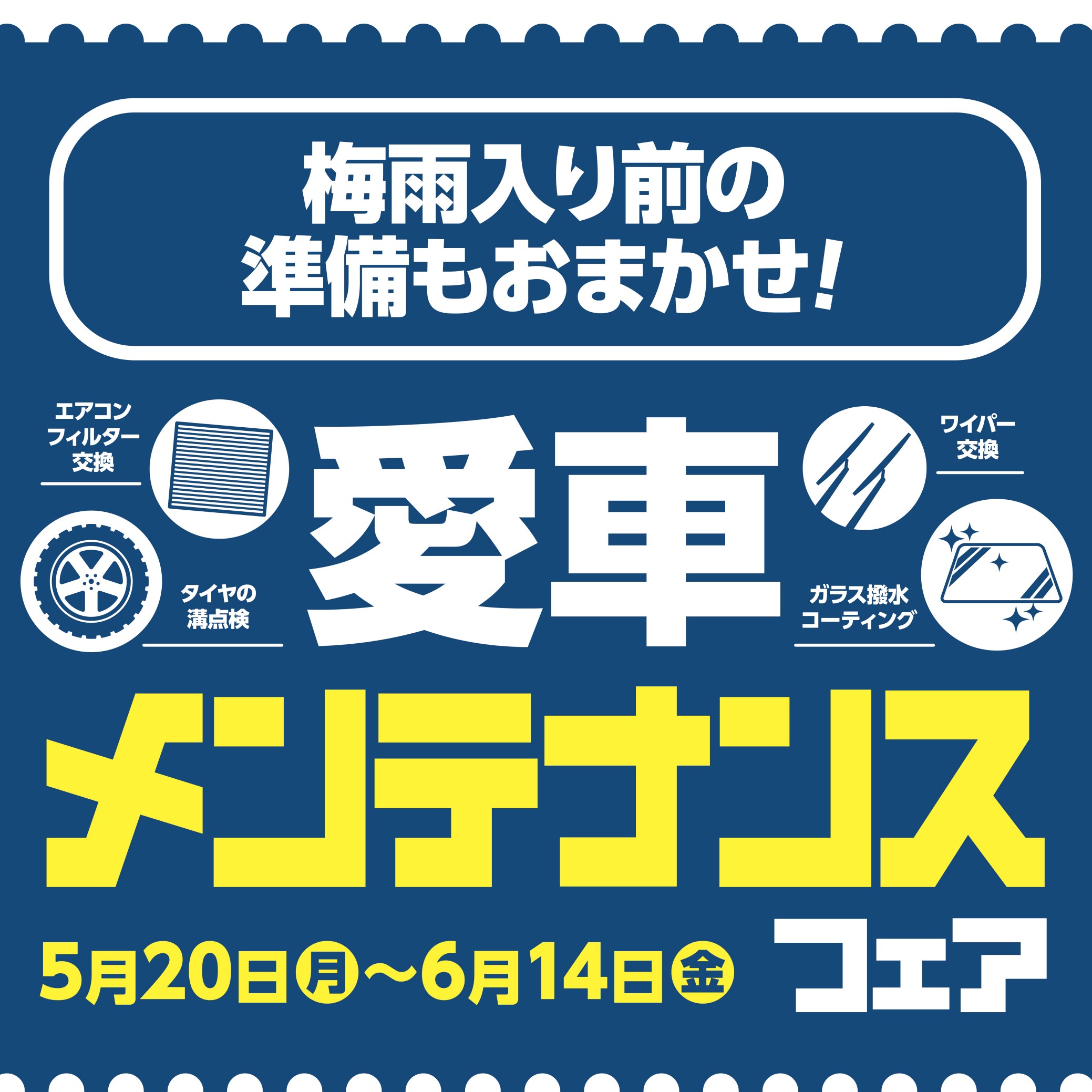 『愛車メンテナンスフェア』開催します! ポスト 2024年5月17日 タイヤ館しばたでは 5月20日(月)から6月14日(金)の期間 『愛車メンテナンスフェア』を 開催致します! だんだん暑くなってきました。 夏の前には「梅雨」が待ってます。 雨天シーズン本番前に 愛車のリフレッシュを いかがでしょうか? お出かけ時のトラブル回避には お出かけ前の愛車点検 メンテナンスがおススメです。 アプリやアンケートのクーポンで オトクに交換できちゃいます! お車の無料点検も実施してます。 この機会にお車の点検、 メンテナンスしちゃいませんか? 皆様のご来店お待ちしております。 カテゴリ:お知らせ