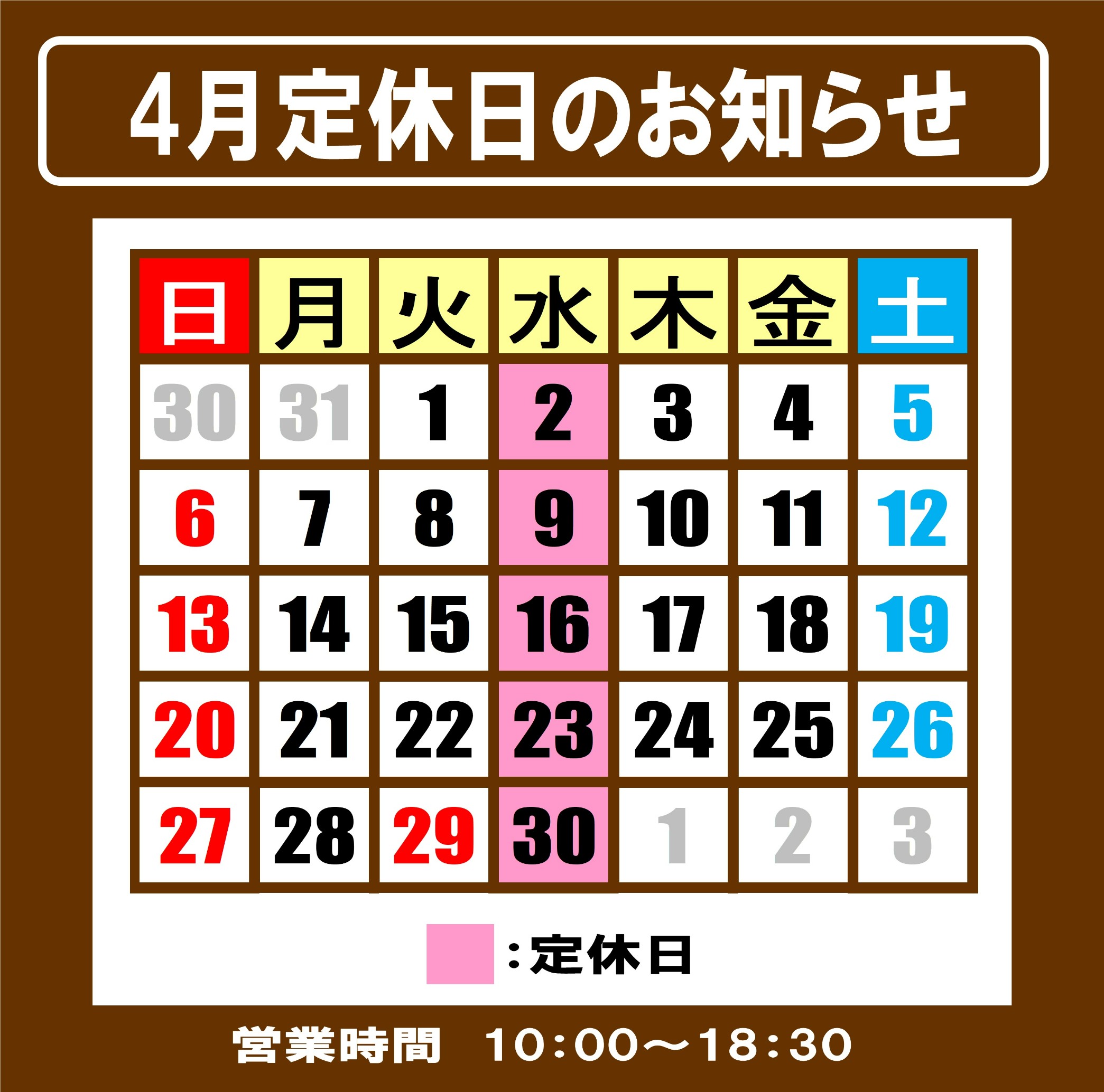 4月定休日のお知らせ