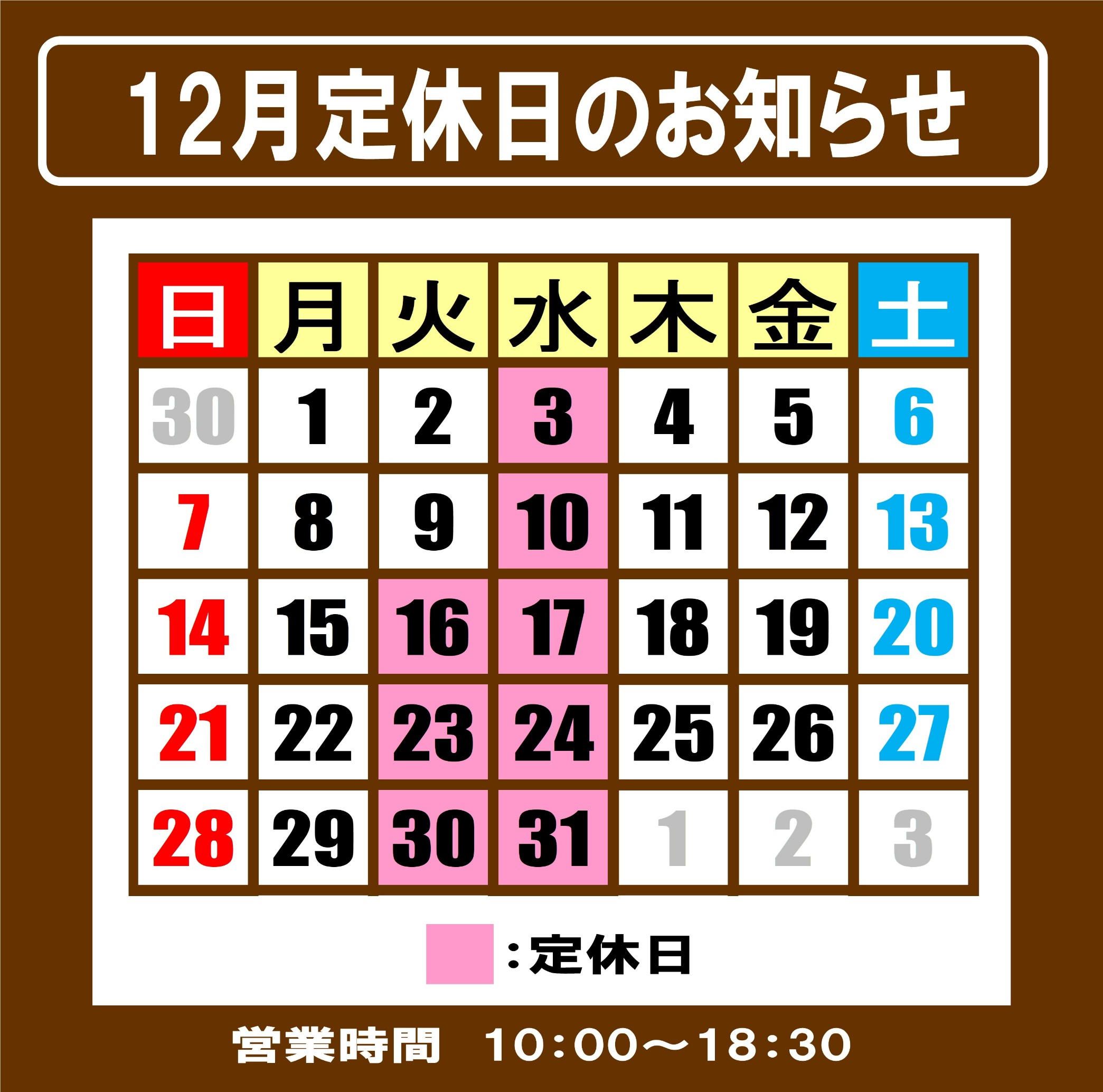 12月定休日のお知らせ