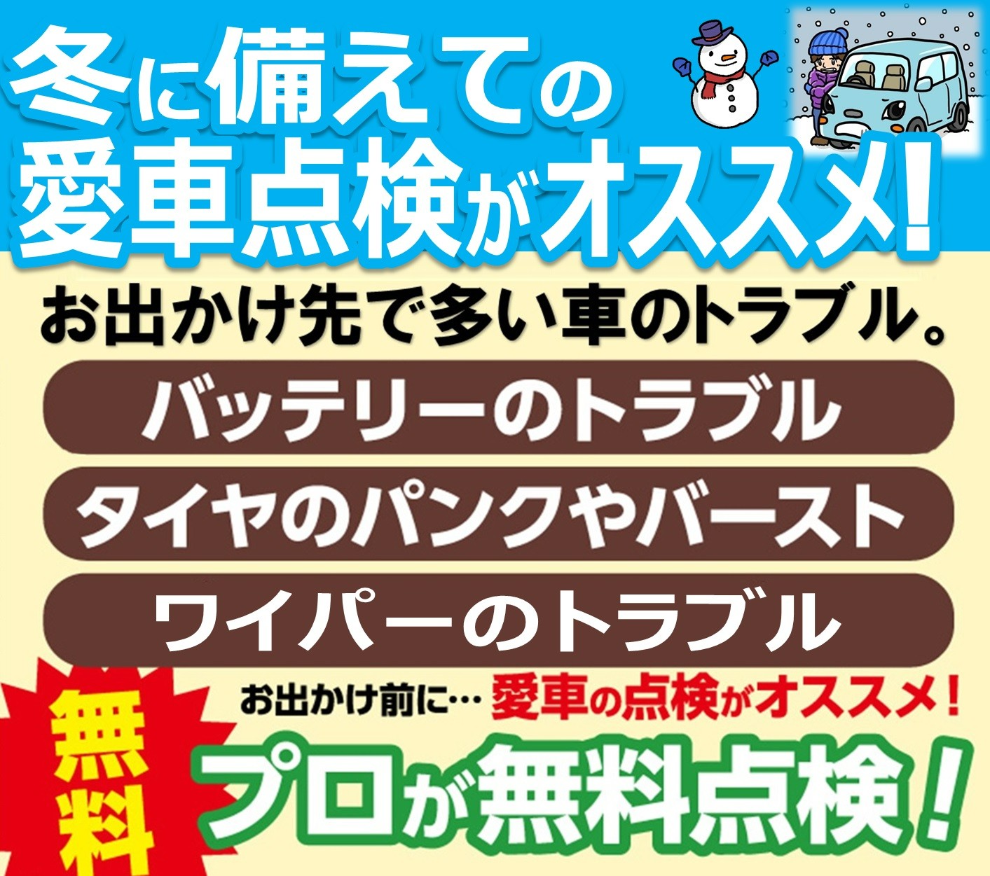 タイヤだけじゃない!冬の準備はお早めに! ポスト 2025年11月30日 お車の冬の準備はお済みですか? よくあるトラブルは ・タイヤ交換しようとしたら溝がなかった ・タイヤ交換しようとしたらパンクしていた ・朝、クルマのエンジンがかからない・・・ などです。 気温が下がると タイヤの内圧も低下しますが バッテリーの電圧も低下します。 冬本番前にシッカリ点検しておきましょう! タイヤ館しばたでは 無料点検実施しております。 お気軽にご相談ください。 タイヤ館 しばた 住所:957-0062新潟県新発田市富塚町3-3-6 電話番号: 0254-27-5131 相談予約 タイヤ点検・安全点検/タイヤ履き替え/オイル交換/その他ピット作業の予約 カテゴリ:お知らせ 点検