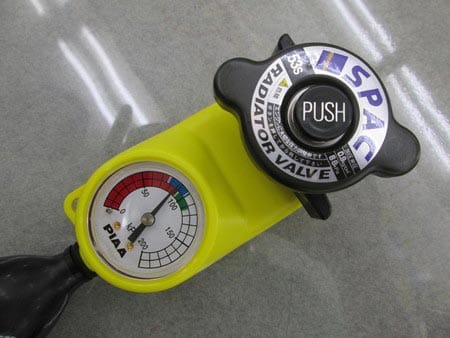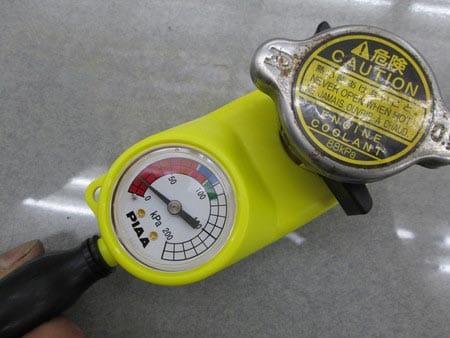 当店では画像にあるテスターを使用して疑似的に圧を掛ける事によりラジエーターキャップの状態を測定する事ができます。