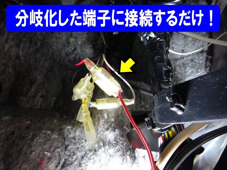 分岐の端子に接続し、ボディアースを設置すれば、電源周りはOK!