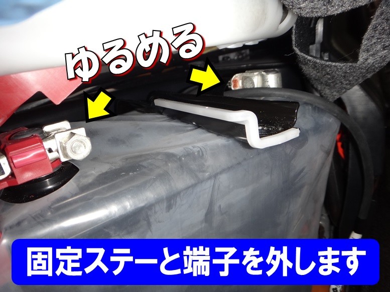 バッテリー固定ステーを外し、端子のナットを緩めます
