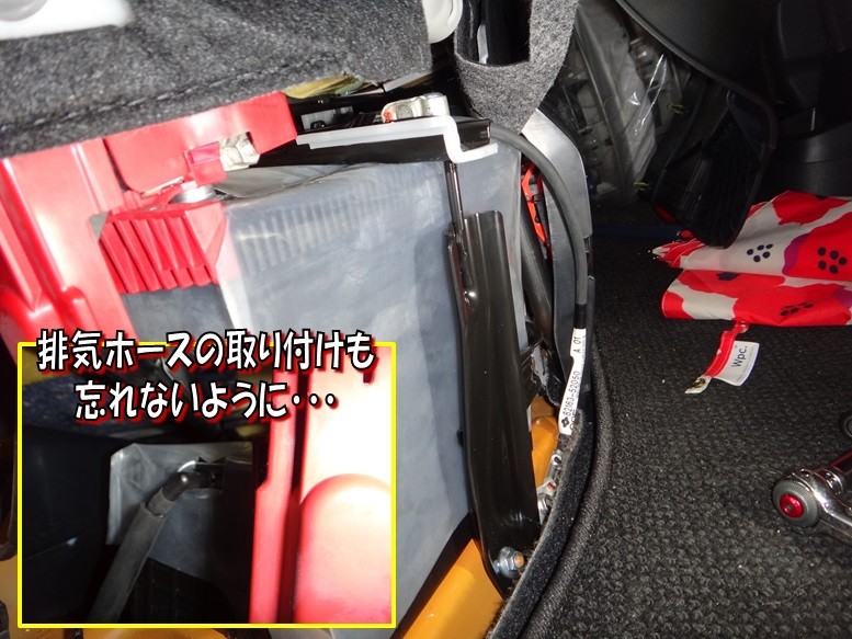 バッテリーを空間に設置したら、先に排気ホースをつけておきます