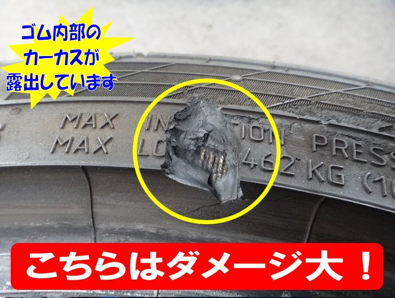 タイヤ空気圧を抑え込み強度を担保するコードが露出してしまっています。