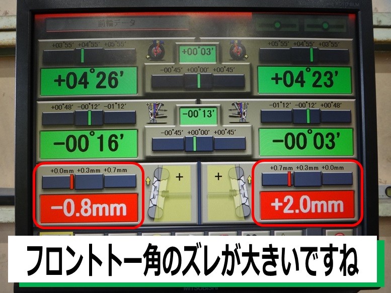 衝撃の影響かは分かりませんが、フロントトー角に大きなズレがあるようです。