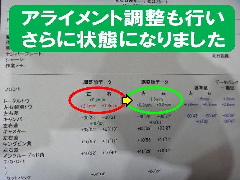 各種ゴムブッシュにも異常は無かったため、メーカー基準値にて調整しました。