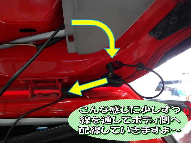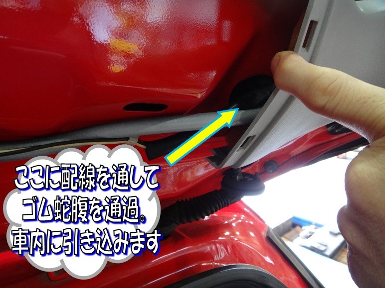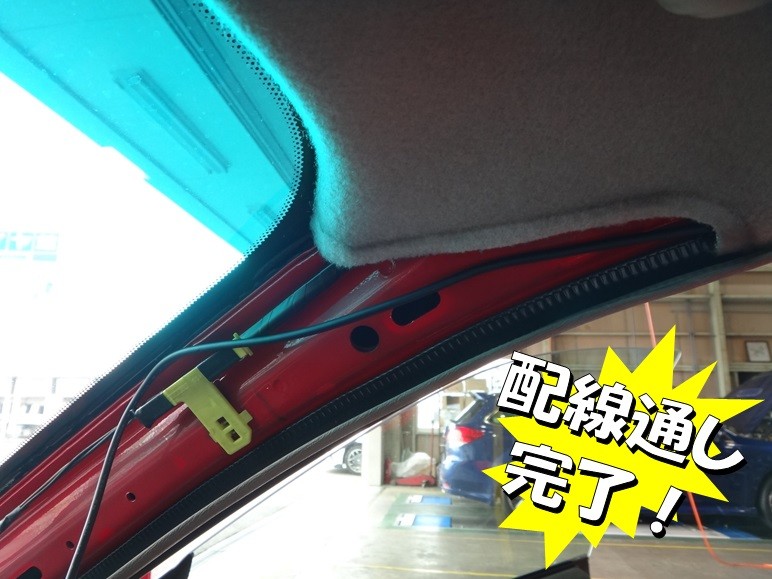 配線作業も最終フロントガラス上部を通して、本体取り付け予定位置まで引き回したら