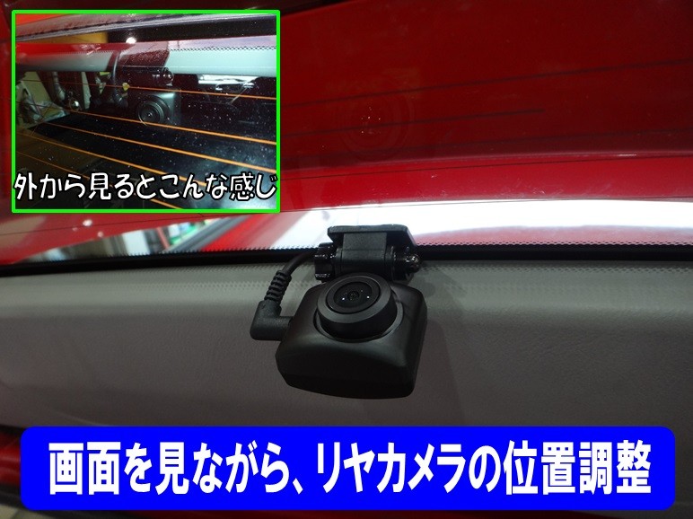 リヤカメラの固定位置を決めてリヤガラスに貼り付け、角度調整も行います。